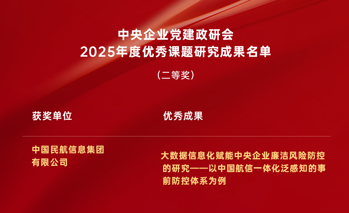【党群工作部 图/文报道】近日,中央企业党建思想政治工作研究会正式发布2025年度优秀课题研究成果名单,中国航信《大数据信息化赋能中央企业廉洁风险防控的研究——以中国航信一体化泛感知的事前防控体系为例》课题获优秀成果二等奖。