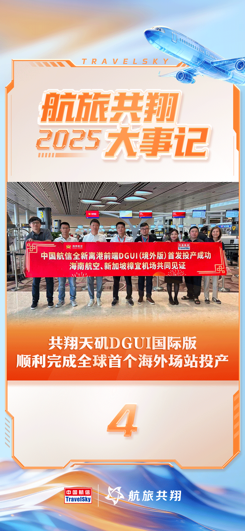 共翔天矶DGUI国际版 顺利完成全球首个海外场站投产 2025年10月22日,中国航信自主研发的共翔天矶DGUI国际版在新加坡樟宜机场顺利完成全球首个海外场站投产,标志着中国民航自主研发核心信息技术首次成功走向海外,实现了从“引进来”到“走出去”的历史性跨越。