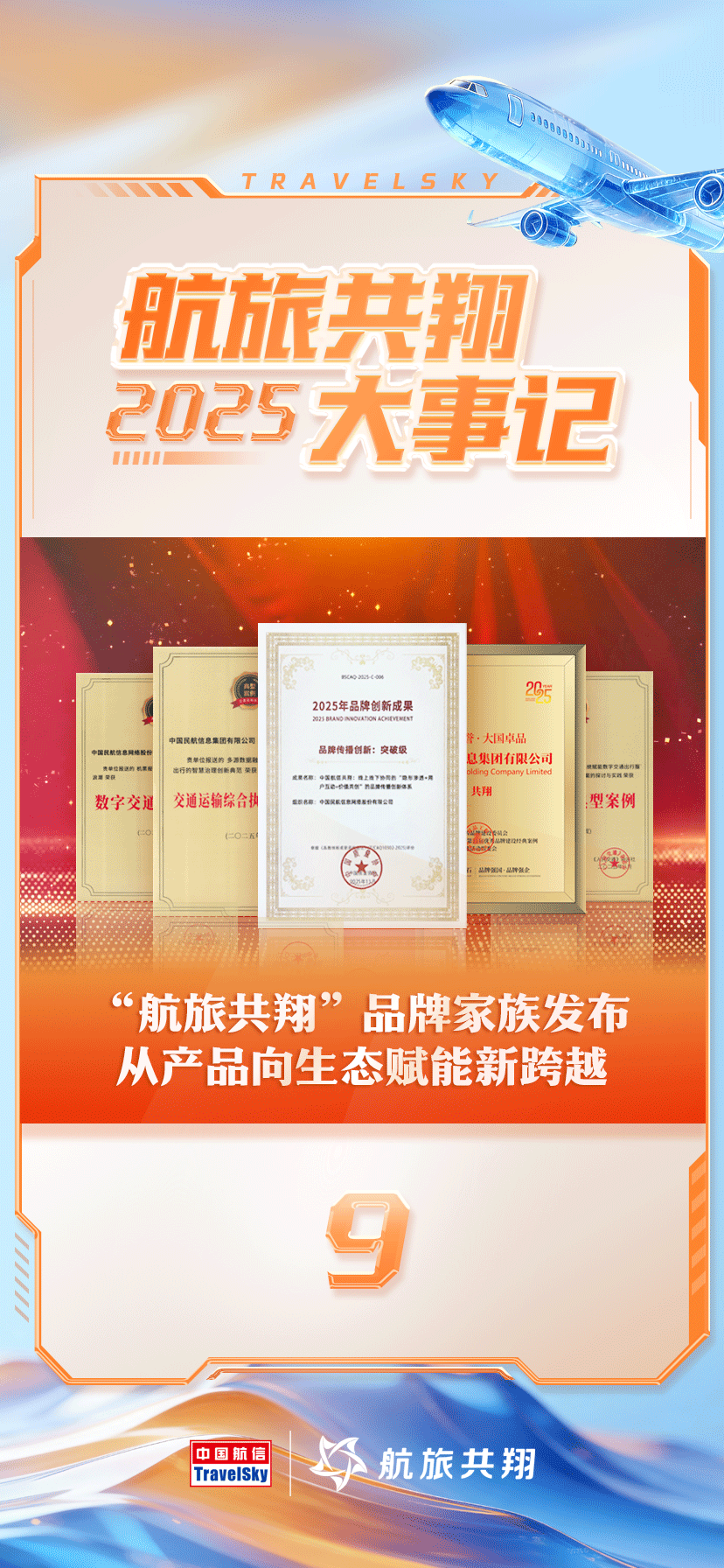 “航旅共翔”品牌家族发布 从产品向生态赋能新跨越 2025年,“航旅共翔”品牌家族正式发布,建成“核心品牌+细分产品”的多层级品牌架构,实现从单一产品品牌向生态品牌的跨越,集中释放品牌战略势能。品牌建设成果荣膺中国质量协会品牌创新突破奖、双品工程“特别荣誉·大国卓品”等多项荣誉。 航旅共翔系统三项创新成果入选2025交通安全创新大会暨数字交通发展论坛典型案例:《多源数据融合精准拦截失信人:民航出行的智慧治理创新典范》获评“交通运输综合执法典型案例”;《机票报销凭证电子化 引领绿色出行新浪潮》和《中国航信共翔系统赋能数字交通出行服务创新——多式联运全流程解决方案的探讨与实践》获评“数字交通典型案例”。