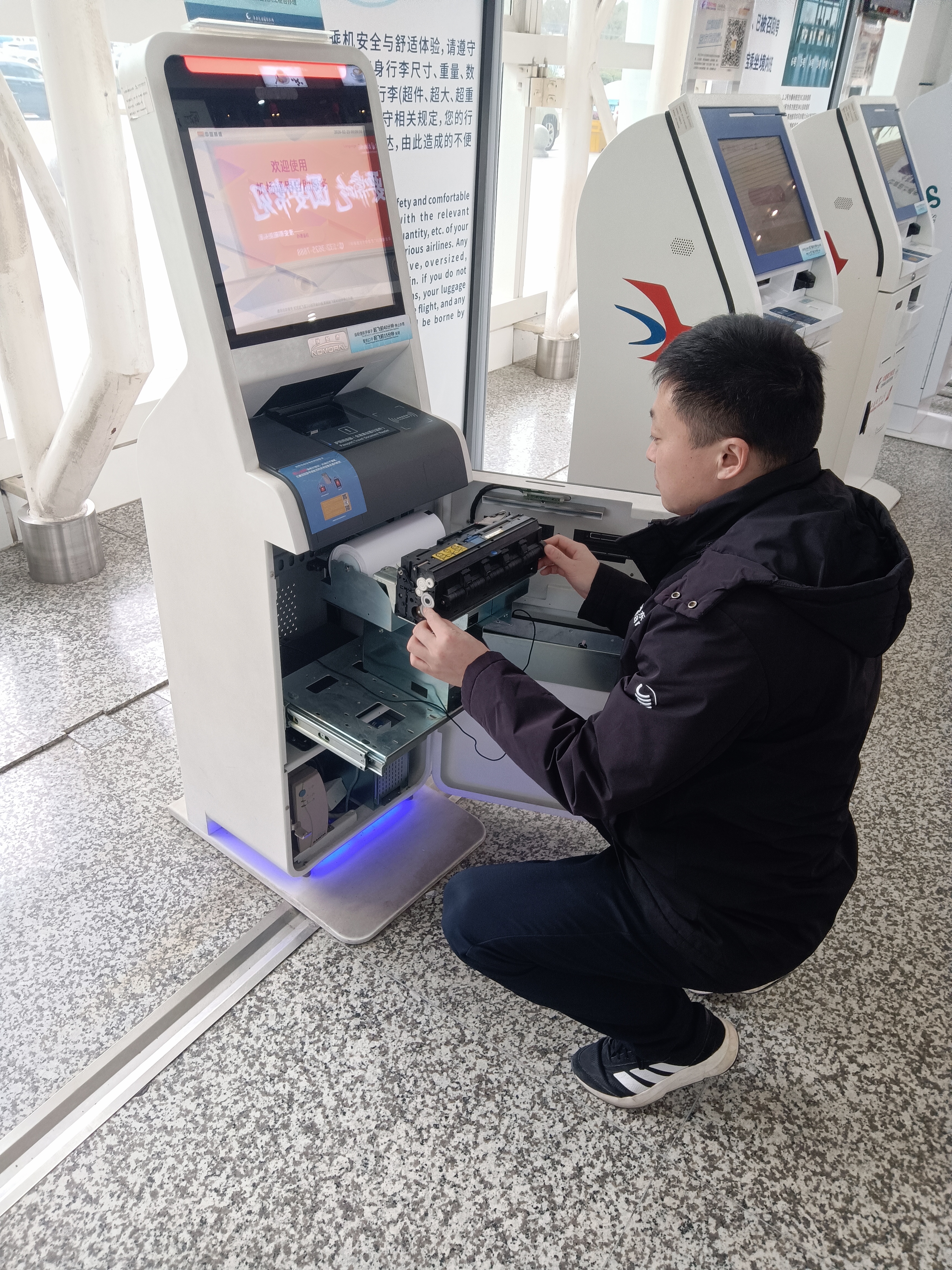淮安,居江淮之间,历史上曾为“南船北马、九省通衢”的交通要冲,是一座典型的交通依托型城市。淮安涟水国际机场旅客吞吐量虽然不大,但对于王大伟来说,春运保障工作仍容不得一丝懈怠。 冬天的淮安,寒风裹挟着刺骨的冷意。凌晨5点,距离首个航班起降还有两小时,中国航信所属华东凯亚派驻淮安机场的运维工程师王大伟已和他的同事们抵达机场。他们步履匆匆,直奔那间空间不大却至关重要的中心机房,开始了一天的工作。 “这里的每一台设备都连接着值机、安检和登机口。我通过监控平台,仔细查看系统运行状态,填写日常巡检表。春运期间,系统的稳定就是我们运维工程师们心头最重的那块‘石头’”。王大伟一边仔细核对数据,一边说道。机房的灯光映在他专注的脸上,键盘敲击声与设备运转声交织成独特的晨曲。他深知,这里每一个参数的波动,都可能牵动千里之外旅客的归途。 完成机房的巡检后,王大伟的身影又出现在值机柜台间。这里是旅客出行的第一站,也是他守护的“前沿阵地”。“春运期间,旅客量大、设备使用频繁,我们必须确保万无一失”。他俯身检查柜台内的打印机、身份证阅读器,手指在设备间灵活穿梭,像一位经验丰富的“设备医生”。工具包里那把常年备着的螺丝刀,此刻正被他握在手中——这是他的“听诊器”,也是他的“手术刀”。更换耗材、排查线路、校准参数……每一项操作都精准如手术。